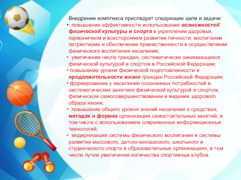 Слайд 14Внедрение комплекса преследует следующие цели и задачи: