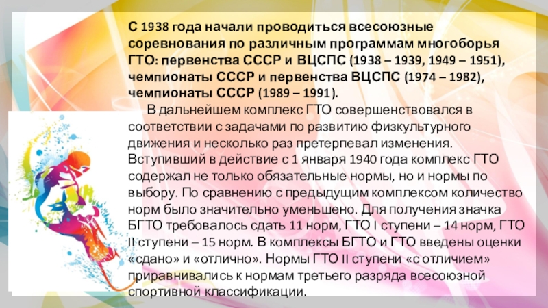 Слайд 12С 1938 года начали проводиться всесоюзные соревнования по различным программам многоборья