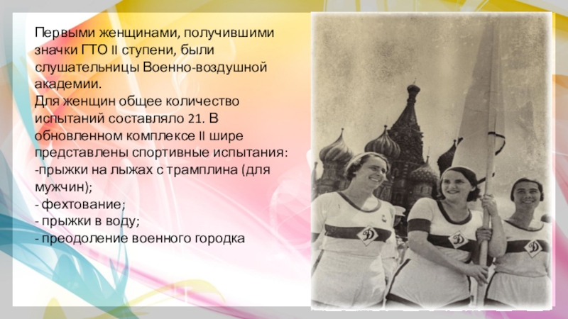 Слайд 10Первыми женщинами, получившими значки ГТО II ступени, были слушательницы Военно-воздушной академии.