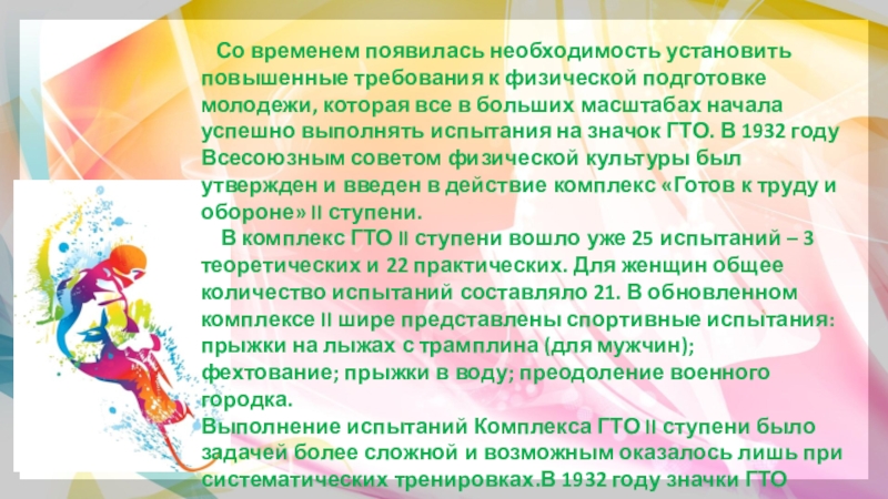 подготовке молодежи, которая все в больших масштабах начала успешно выполнять испытания на значок ГТО. В 1932 году Всесоюзным советом физической культуры был утвержден и введен в действие комплекс «Готов к труду и обороне» II ступени.