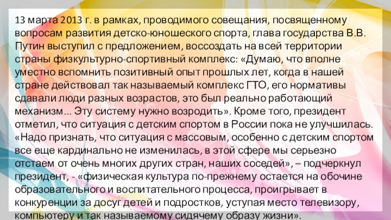 детско-юношеского спорта, глава государства В.В. Путин выступил с предложением, воссоздать на всей территории страны физкультурно-спортивный комплекс: «Думаю, что вполне уместно вспомнить позитивный опыт прошлых лет, когда в нашей стране действовал так называемый комплекс ГТО, его нормативы сдавали люди разных возрастов, это был реально работающий механизм... Эту систему нужно возродить». Кроме того, президент отметил, что ситуация с детским спортом в России пока не улучшилась. «Надо признать, что ситуация с массовым, особенно с детским спортом все еще кардинально не изменилась, в этой сфере мы серьезно отстаем от очень многих других стран, наших соседей», – подчеркнул президент, - «физическая культура по-прежнему остается на обочине образовательного и воспитательного процесса, проигрывает в конкуренции за досуг детей и подростков, уступая место телевизору, компьютеру и так называемому сидячему образу жизни».