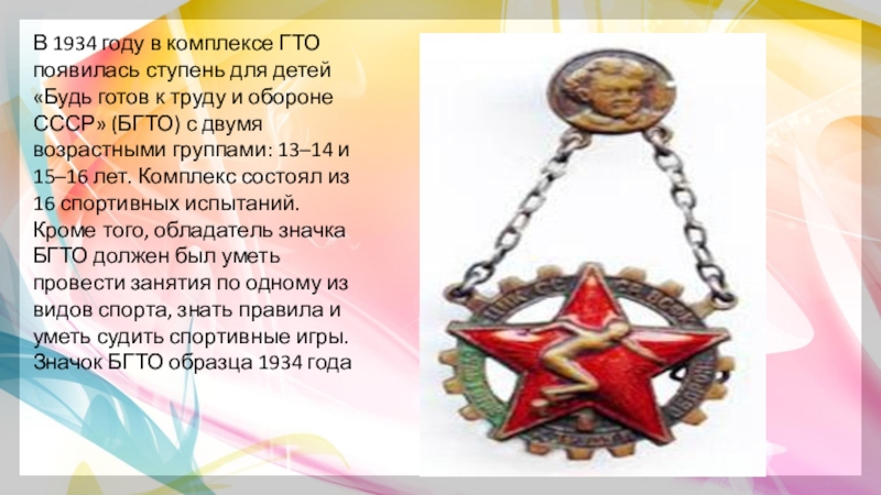 Слайд 11В 1934 году в комплексе ГТО появилась ступень для детей «Будь