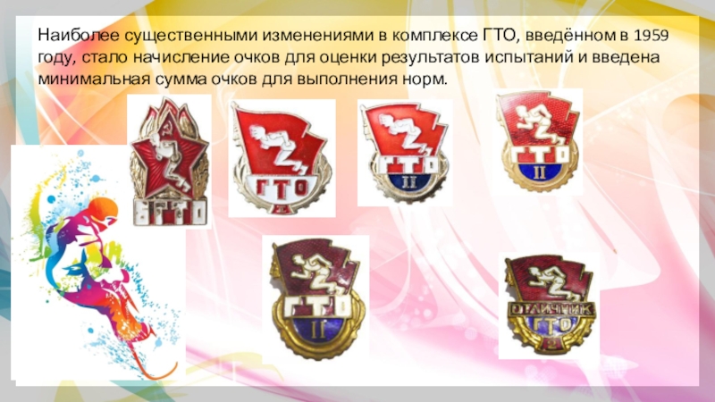 Слайд 15Наиболее существенными изменениями в комплексе ГТО, введённом в 1959 году, стало