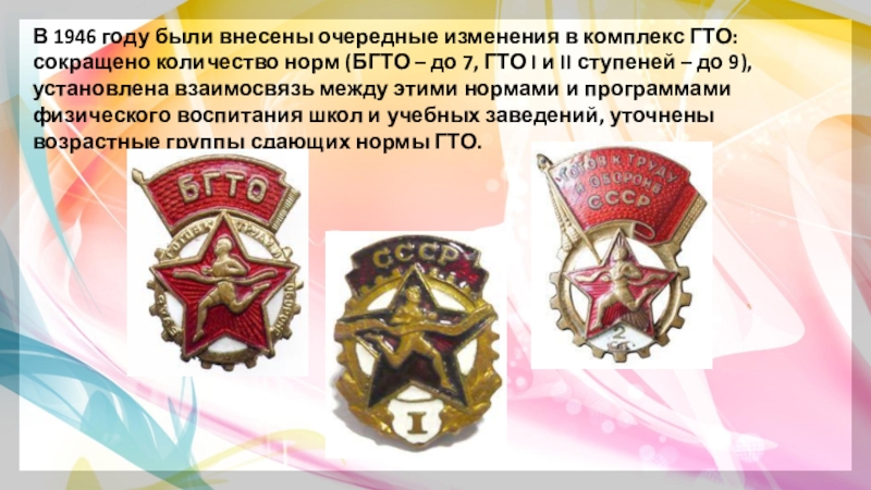 Слайд 14В 1946 году были внесены очередные изменения в комплекс ГТО: сокращено