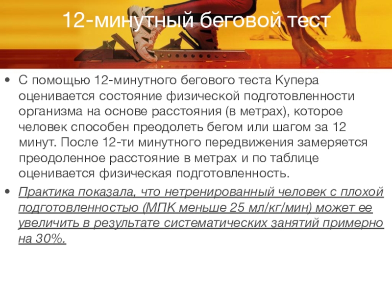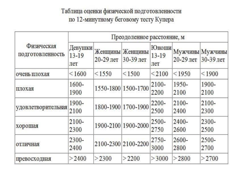 подготовленности организма на основе расстояния (в метрах), которое человек способен преодолеть бегом или шагом за 12 минут. После 12-ти минутного передвижения замеряется преодоленное расстояние в метрах и по таблице оценивается физическая подготовленность.