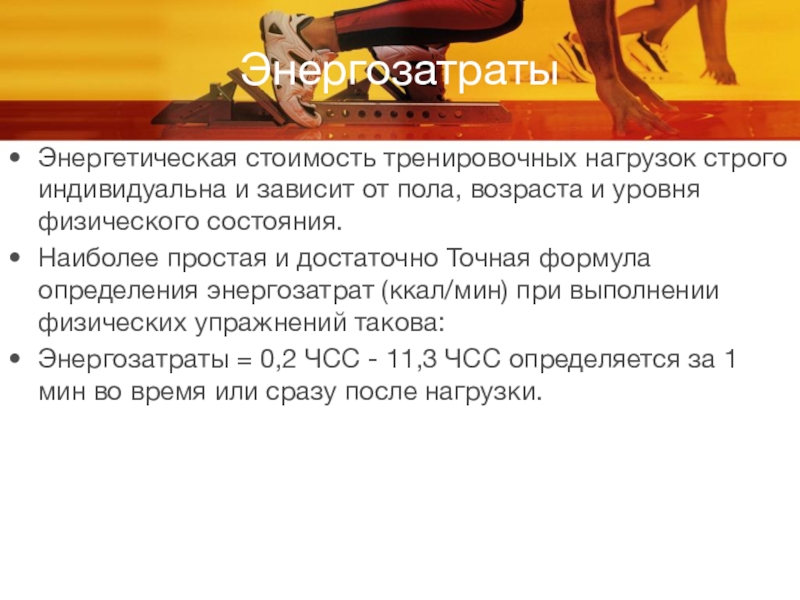 Энергозатраты = 0,2 ЧСС - 11,3 ЧСС определяется за 1 мин во время или сразу после нагрузки.
