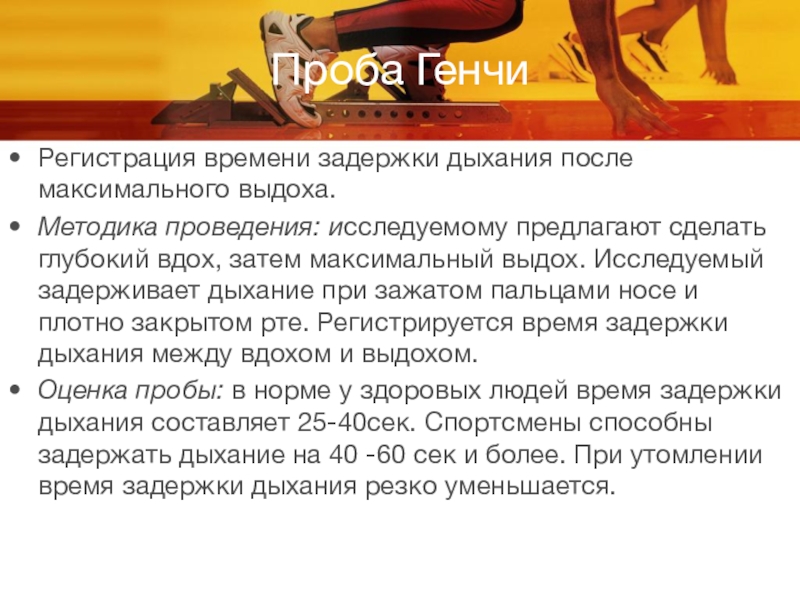предлагают сделать вдох, выдох, а затем вдох на уровне 85-95% от максимального. При этом плотно закрывают рот и зажимают нос пальцами. Регистрируют время задержки дыхания.
