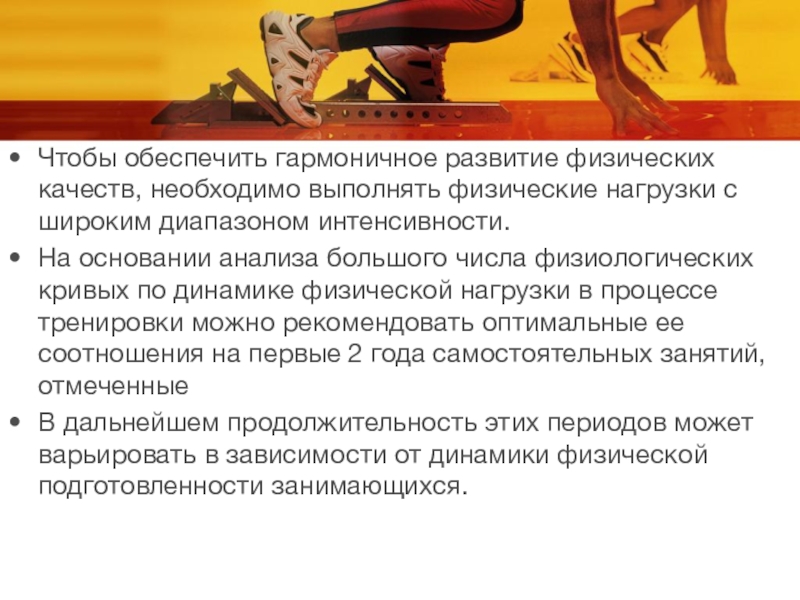 Слайд 19Чтобы обеспечить гармоничное развитие физических качеств, необходимо выполнять физические нагрузки с