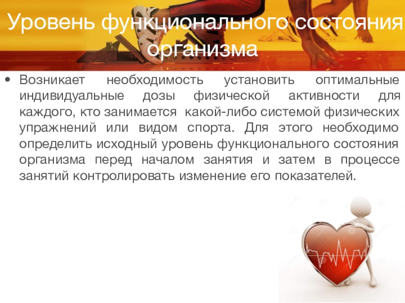 для каждого, кто занимается какой-либо системой физических упражнений или видом спорта. Для этого необходимо определить исходный уровень функционального состояния организма перед началом занятия и затем в процессе занятий контролировать изменение его показателей.