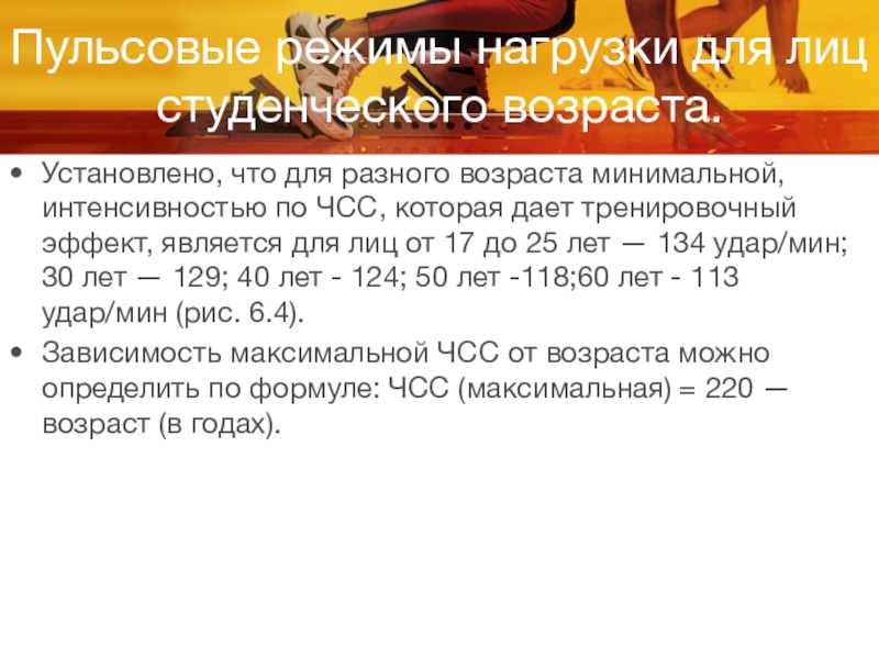 Слайд 14Пульсовые режимы нагрузки для лиц студенческого возраста.