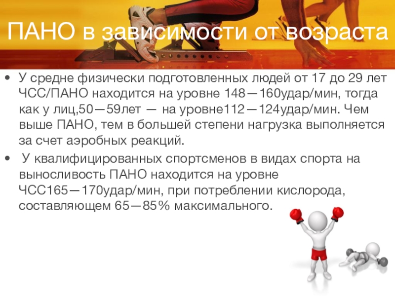 17 до 29 лет ЧСС/ПАНО находится на уровне 148—160удар/мин, тогда как у лиц,50—59лет — на уровне112—124удар/мин. Чем выше ПАНО, тем в большей степени нагрузка выполняется за счет аэробных реакций.