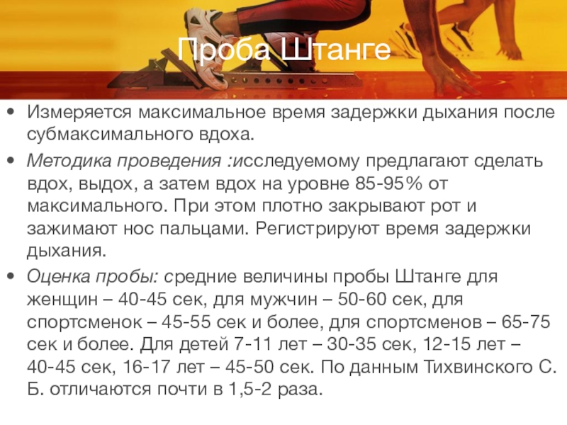 Оценка пробы: средние величины пробы Штанге для женщин – 40-45 сек, для мужчин – 50-60 сек, для спортсменок – 45-55 сек и более, для спортсменов – 65-75 сек и более. Для детей 7-11 лет – 30-35 сек, 12-15 лет – 40-45 сек, 16-17 лет – 45-50 сек. По данным Тихвинского С.Б. отличаются почти в 1,5-2 раза.