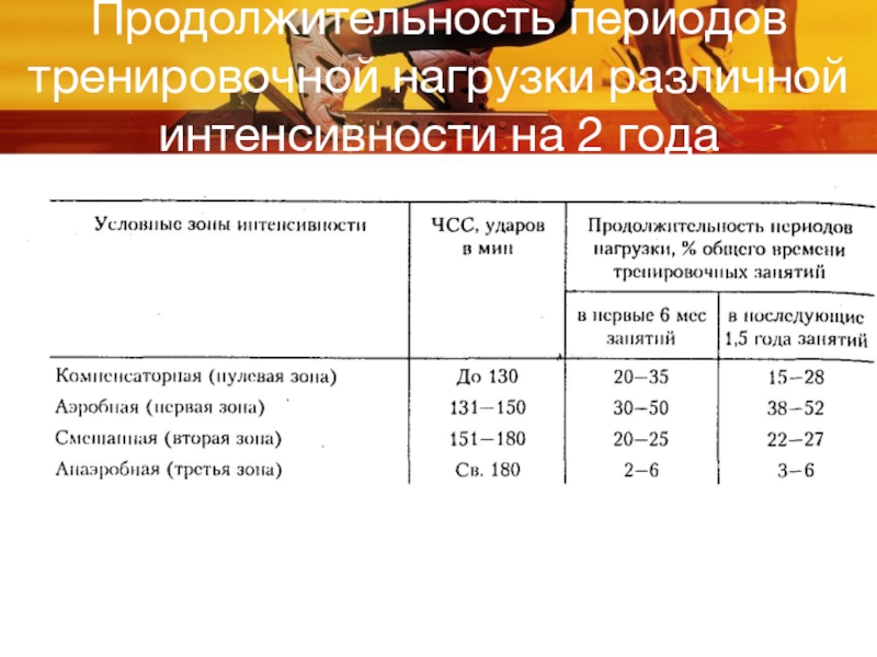 Слайд 20Продолжительность периодов тренировочной нагрузки различной интенсивности на 2 года самостоятельных занятий