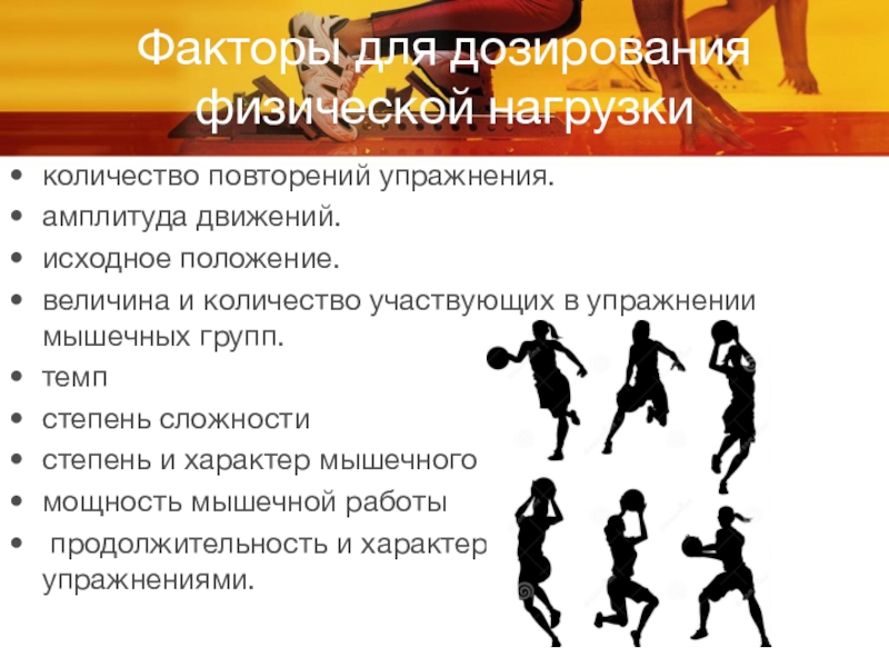 выполняемой работы (интенсивность и объем, скорость и темп движений, величина усилия, продолжительность, число повторений).