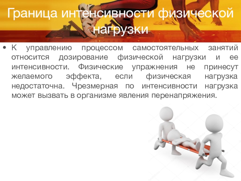 нагрузки и ее интенсивности. Физические упражнения не принесут желаемого эффекта, если физическая нагрузка недостаточна. Чрезмерная по интенсивности нагрузка может вызвать в организме явления перенапряжения.