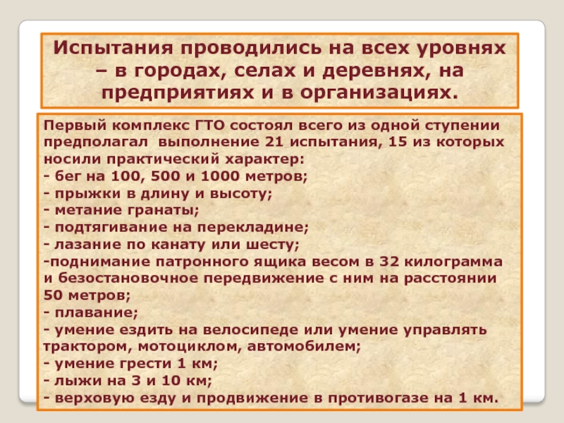 Испытания проводились на всех уровнях – в городах, селах и деревнях, на предприятиях и в организациях.