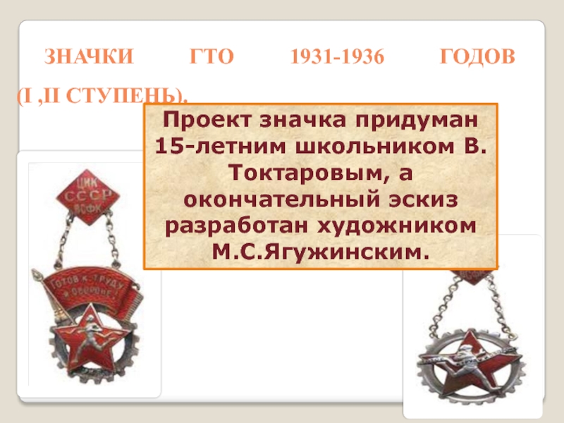 Проект значка придуман 15-летним школьником В.Токтаровым, а окончательный эскиз разработан художником М.С.Ягужинским.
