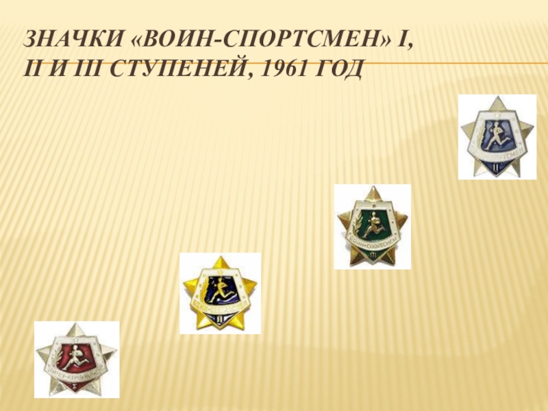 Слайд 20Значки «Воин-спортсмен» I, II и III ступеней, 1961 год