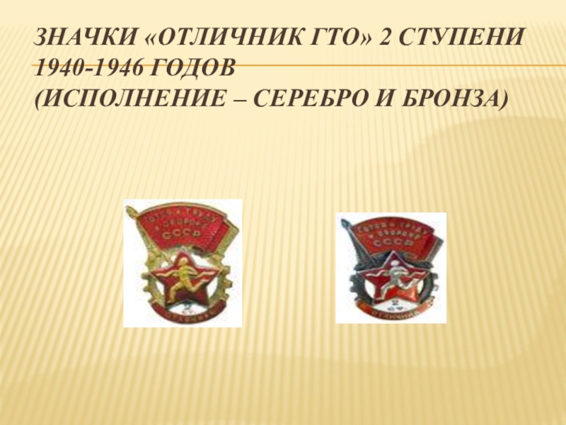 Слайд 17Значки «Отличник ГТО» 2 ступени 1940-1946 годов