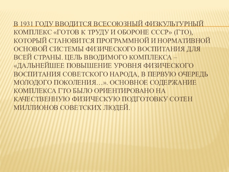 обороне СССР» (ГТО), который становится программной и нормативной основой системы физического воспитания для всей страны. Цель вводимого комплекса – «дальнейшее повышение уровня физического воспитания советского народа, в первую очередь молодого поколения…». Основное содержание комплекса ГТО было ориентировано на качественную физическую подготовку сотен миллионов советских людей.