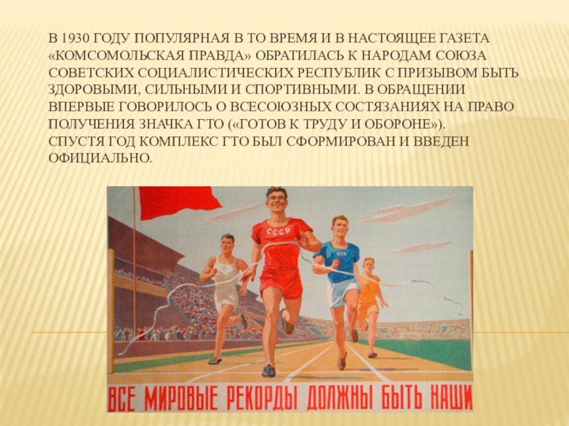 правда» обратилась к народам Союза Советских Социалистических республик с призывом быть здоровыми, сильными и спортивными. В обращении впервые говорилось о всесоюзных состязаниях на право получения значка ГТО («Готов к труду и обороне»).