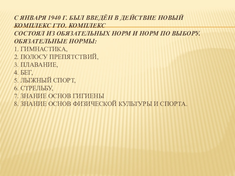 Слайд 10С января 1940 г. был введён в действие новый комплекс ГТО.