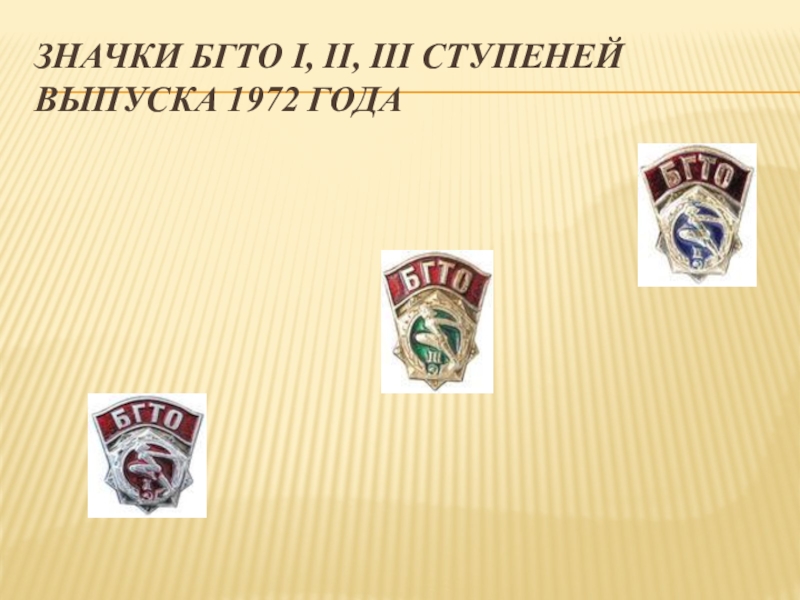 Слайд 21Значки БГТО I, II, III ступеней выпуска 1972 года