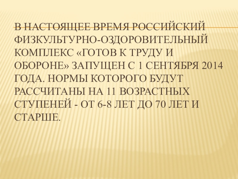 с 1 сентября 2014 года. Нормы которого будут рассчитаны на 11 возрастных ступеней - от 6-8 лет до 70 лет и старше.