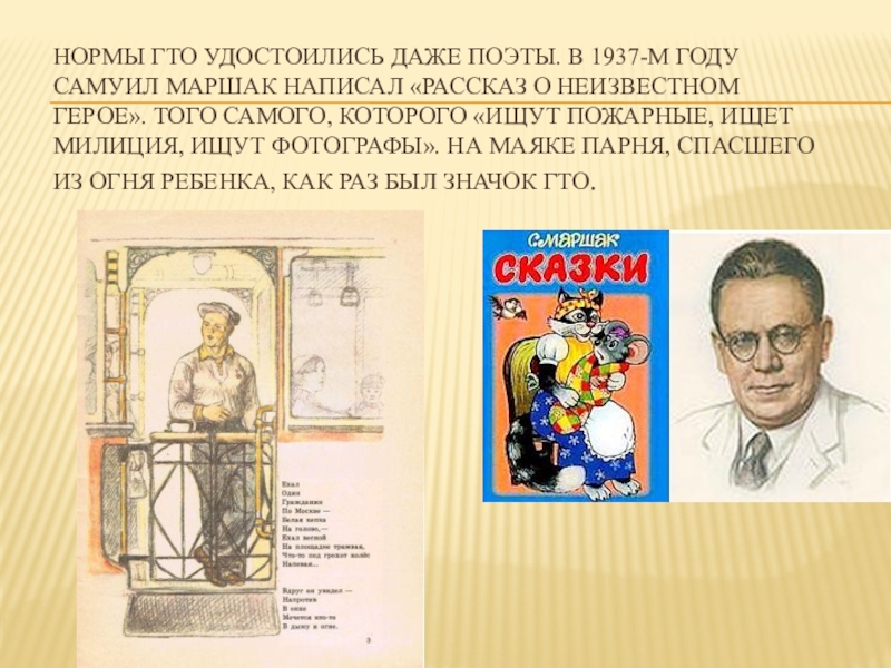 Слайд 5Нормы ГТО удостоились даже поэты. В 1937-м году Самуил Маршак написал «Рассказ