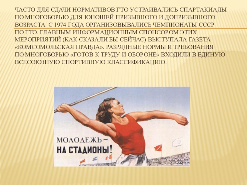 Слайд 7Часто для сдачи нормативов ГТО устраивались спартакиады по многоборью для юношей призывного