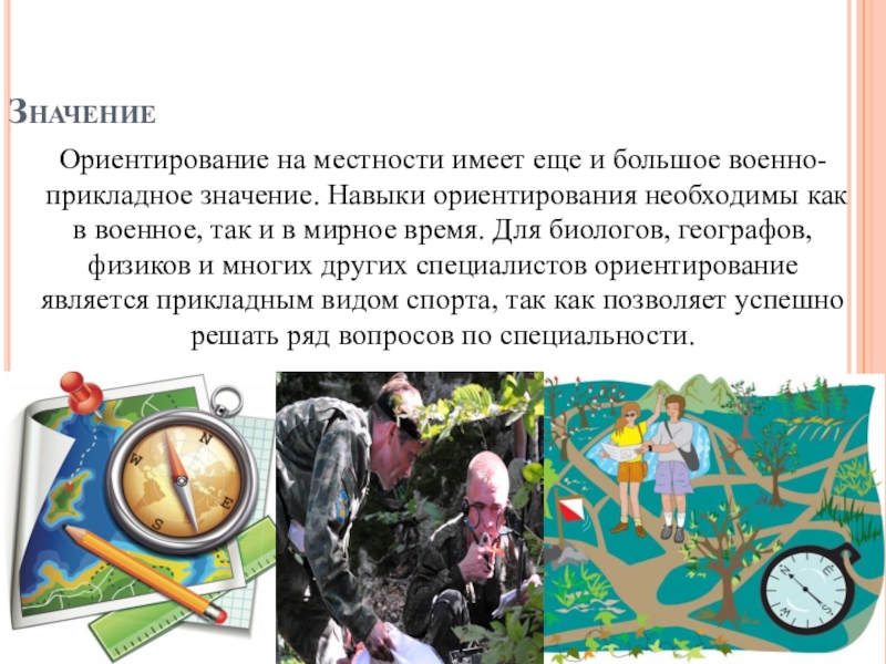 ЗначениеОриентирование на местности имеет еще и большое военно-прикладное значение. Навыки ориентирования необходимы как в военное, так и