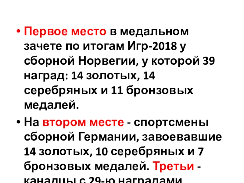 Слайд 5Первое место в медальном зачете по итогам Игр-2018 у сборной Норвегии,