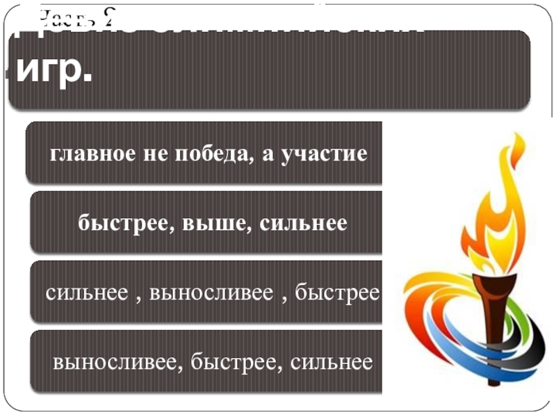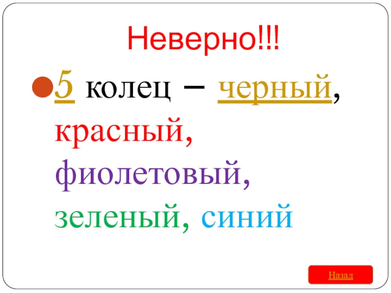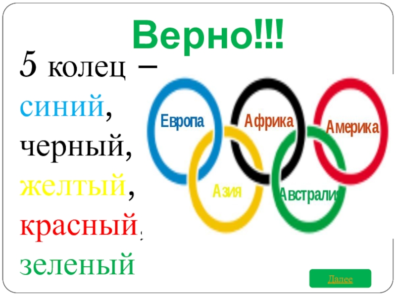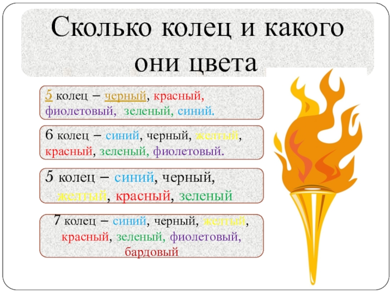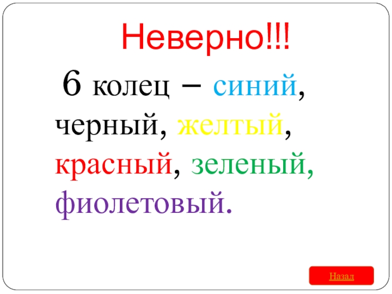 6 колец – синий, черный, желтый, красный, зеленый, фиолетовый.