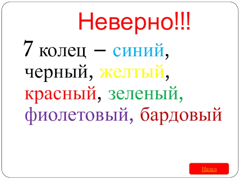7 колец – синий, черный, желтый, красный, зеленый, фиолетовый, бардовый