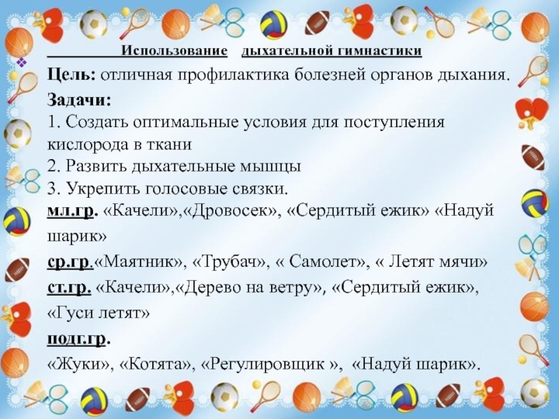 ср.гр.«Маятник», «Трубач», « Самолет», « Летят мячи»