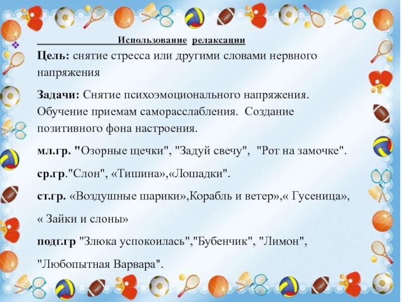 Задачи: Снятие психоэмоционального напряжения. Обучение приемам саморасслабления. Создание позитивного фона настроения.