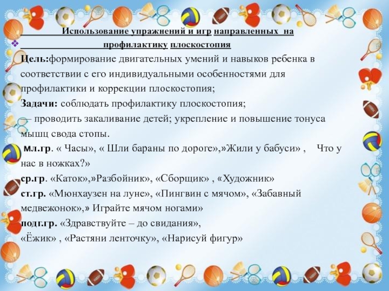 Цель:формирование двигательных умений и навыков ребенка в соответствии с его индивидуальными особенностями для профилактики и коррекции плоскостопия;