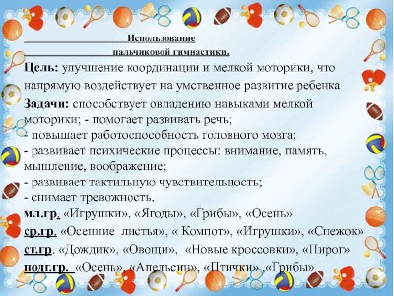 Задачи: способствует овладению навыками мелкой моторики; - помогает развивать речь;