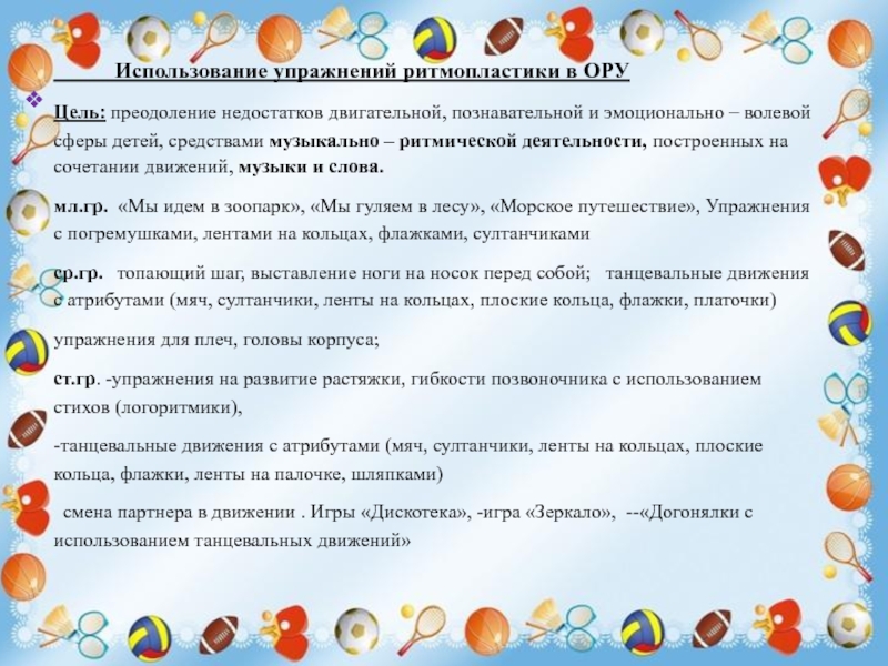 -танцевальные движения с атрибутами (мяч, султанчики, ленты на кольцах, плоские кольца, флажки, ленты на палочке, шляпками)