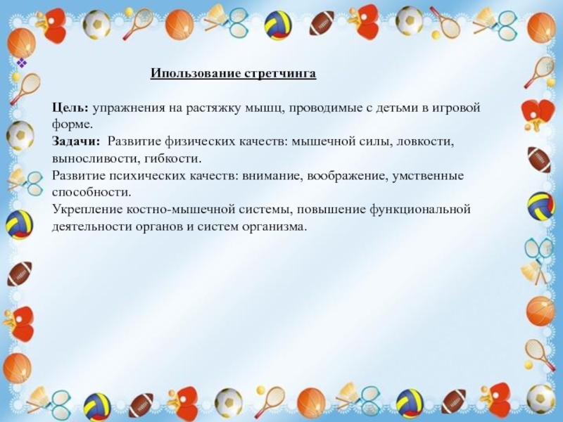 Цель: упражнения на растяжку мышц, проводимые с детьми в игровой форме.