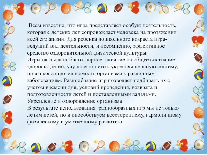 лет сопровождает человека на протяжении всей его жизни. Для ребенка дошкольного возраста игра-ведущий вид деятельности, и несомненно, эффективное средство оздоровительной физической культуры.