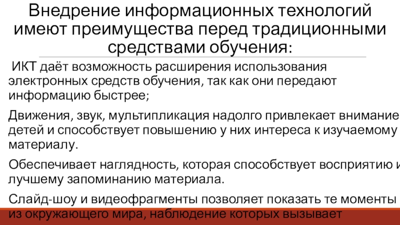 Слайд 12Внедрение информационных технологий имеют преимущества перед традиционными средствами обучения: