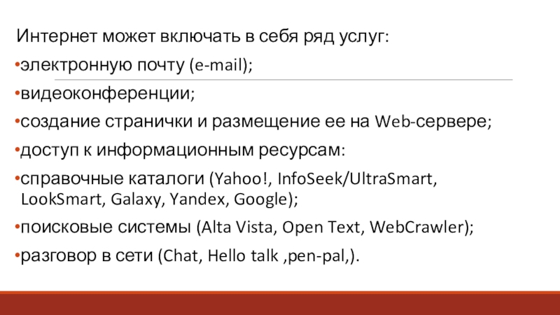 поисковые системы (Alta Vista, Open Text, WebCrawler);