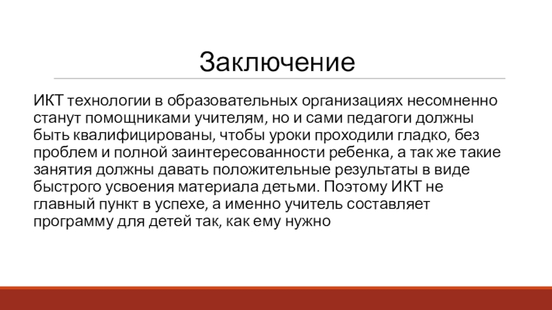 сами педагоги должны быть квалифицированы, чтобы уроки проходили гладко, без проблем и полной заинтересованности ребенка, а так же такие занятия должны давать положительные результаты в виде быстрого усвоения материала детьми. Поэтому ИКТ не главный пункт в успехе, а именно учитель составляет программу для детей так, как ему нужно