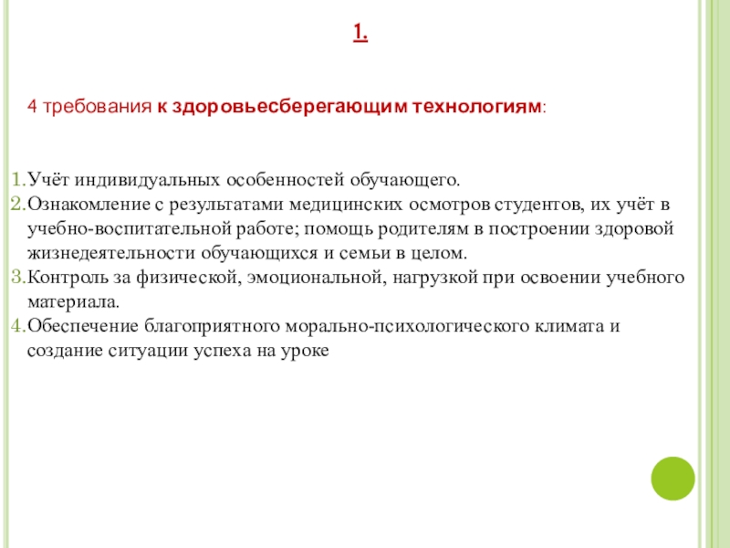 1. 4 требования к здоровьесберегающим технологиям:Учёт индивидуальных особенностей обучающего.Ознакомление с результатами медицинских осмотров студентов, их учёт в