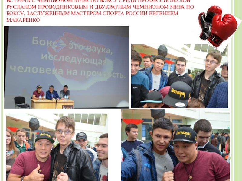 Слайд 17ВСТРЕЧА С ЧЕМПИОНОМ МИРА ПО БОКСУ СРЕДИ ПРОФЕССИОНАЛОВ РУСЛАНОМ ПРОВОДНИКОВЫМ И