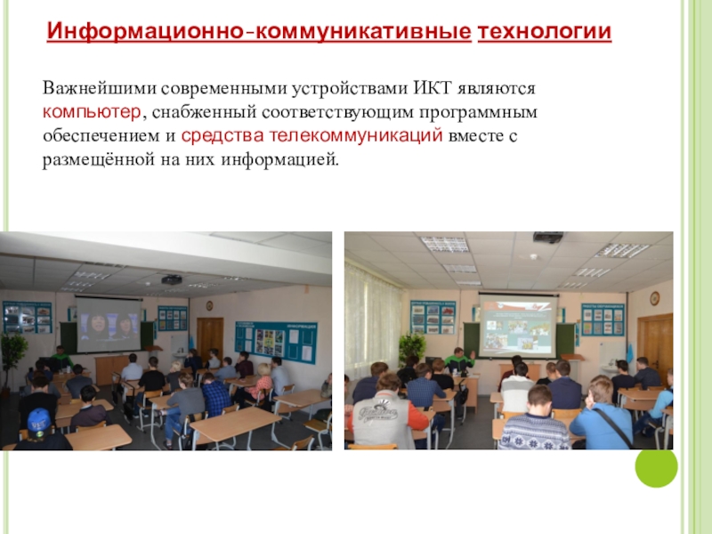Информационно-коммуникативные технологии Важнейшими современными устройствами ИКТ являются компьютер, снабженный соответствующим программным обеспечением и средства телекоммуникаций вместе с