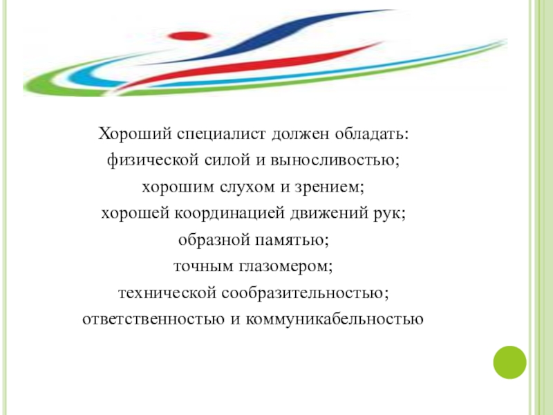 Хороший специалист должен обладать:физической силой и выносливостью;хорошим слухом и зрением;хорошей координацией движений рук;образной памятью;точным глазомером;технической сообразительностью;ответственностью и коммуникабельностью