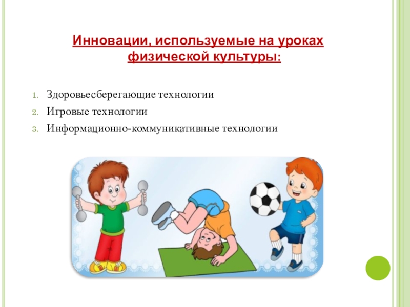 Инновации, используемые на уроках физической культуры:Здоровьесберегающие технологииИгровые технологииИнформационно-коммуникативные технологии