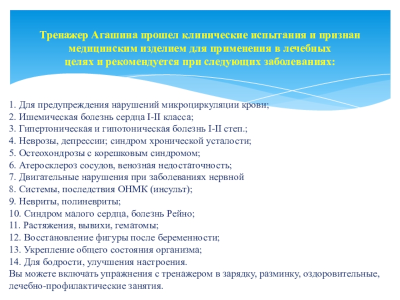 Вы можете включать упражнения с тренажером в зарядку, разминку, оздоровительные, лечебно-профилактические занятия.